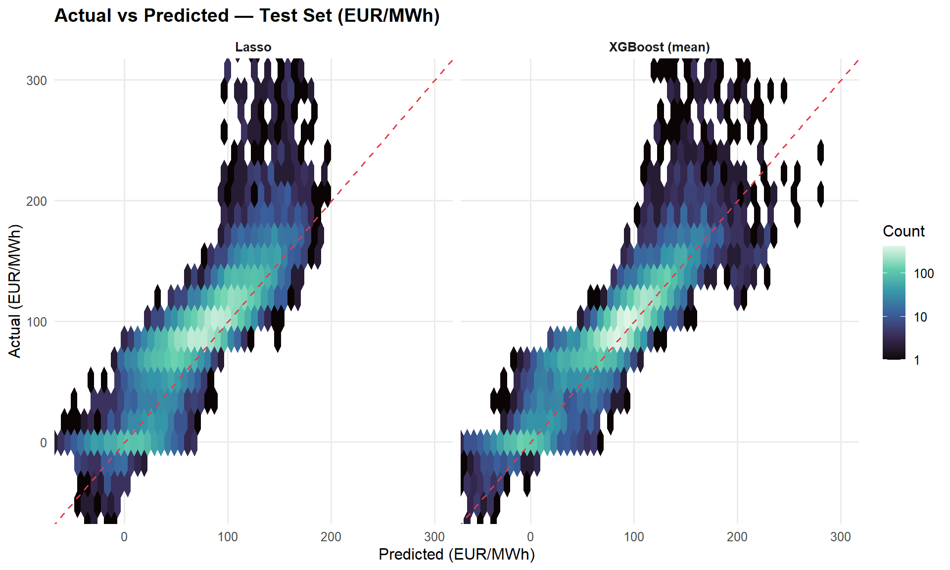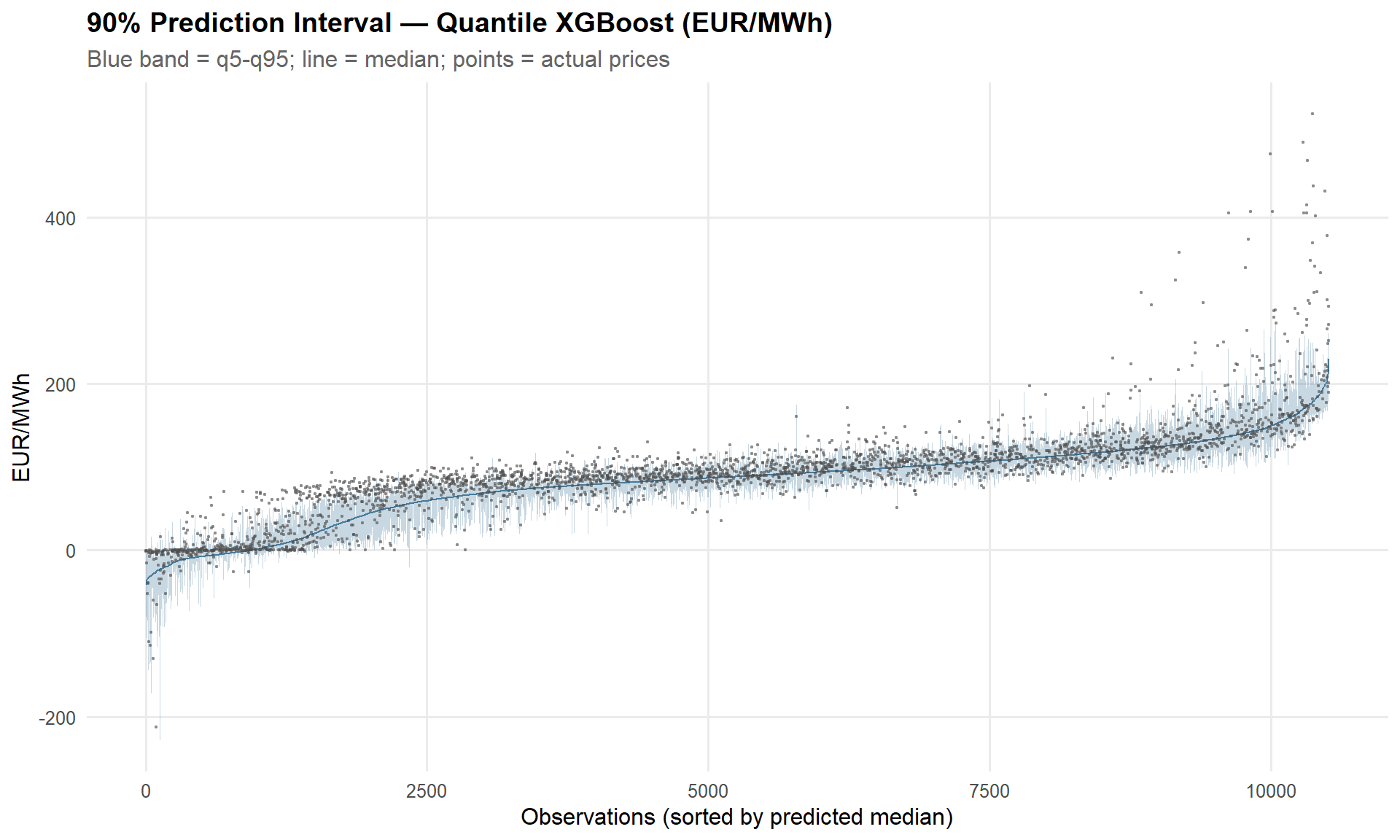 - Quantile XGBoost provides distributional predictions for risk analysis, producing a 90% prediction interval that brackets extreme price events. These feed directly into the Stage 4 VaR/CVaR framework alongside the post-crisis lasso.