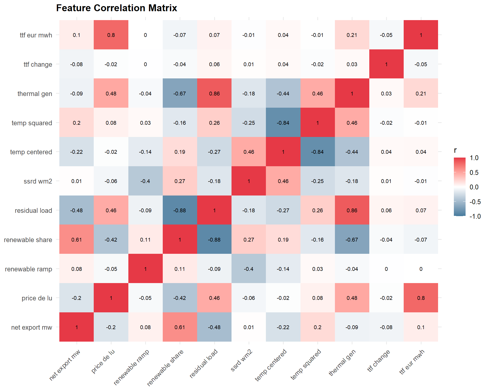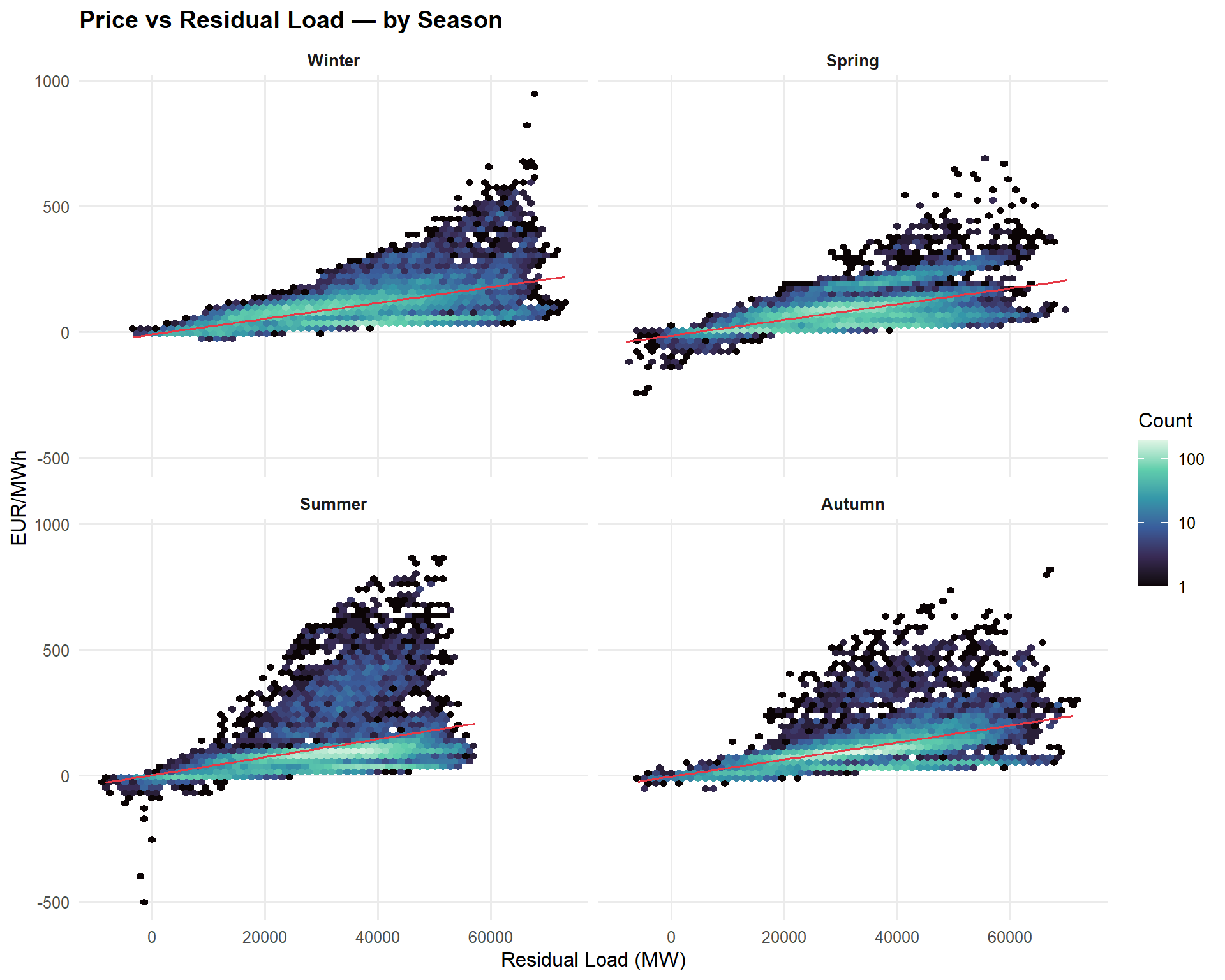 - Residual load is most important in shoulder seasons (spring, autumn), when neither renewable nor gas effects dominate.