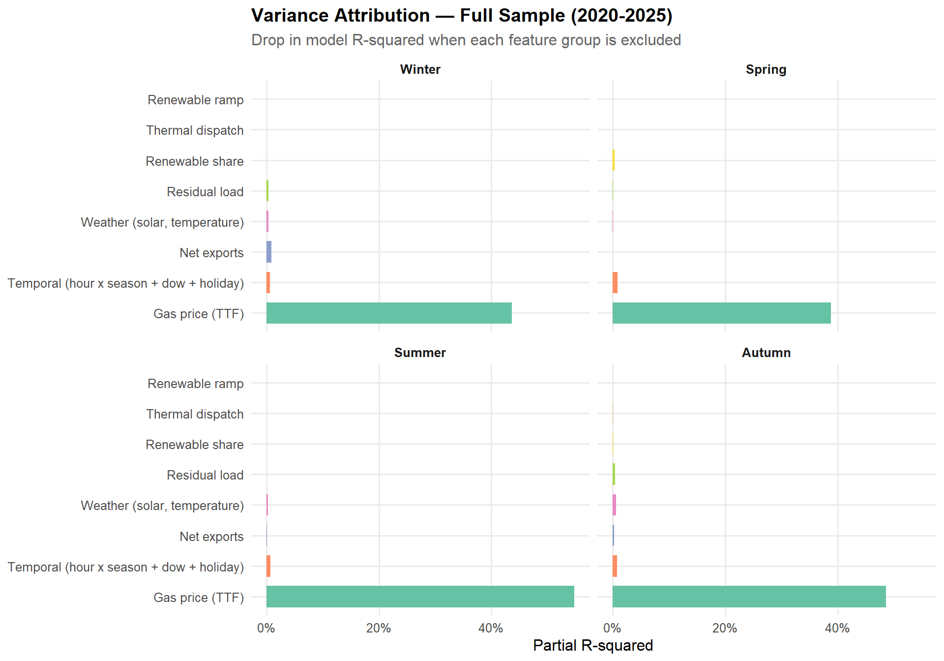- Fuel cost shocks dominated European electricity price variance during 2020-2022. The TTF gas price alone explains 50-80% of seasonal price variance in the full sample — the energy crisis was the single largest source of price risk.