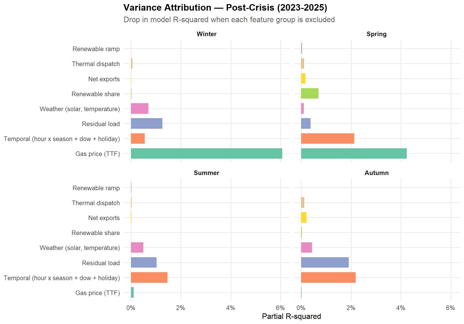 - In the post-crisis market (2023-2025), renewable variability and residual load emerge as the primary drivers. With gas prices stabilised, the merit-order effects that shape day-ahead pricing become visible.