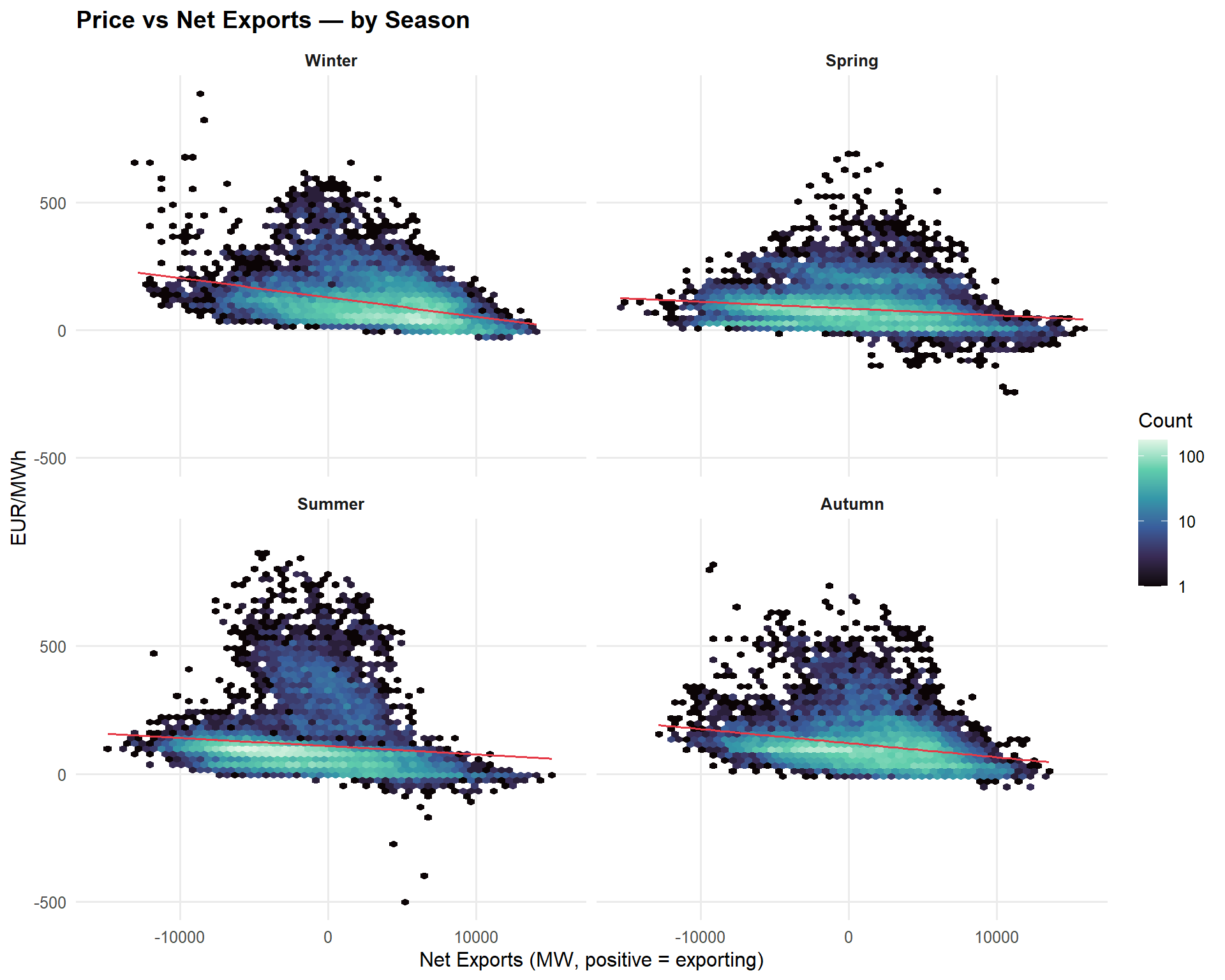 - Net exports have a measurable but secondary effect, consistent with Germany’s central position in the CWE interconnected market. The net export × season interaction reveals that exports tighten supply most in winter when neighbouring zones draw on German baseload.
