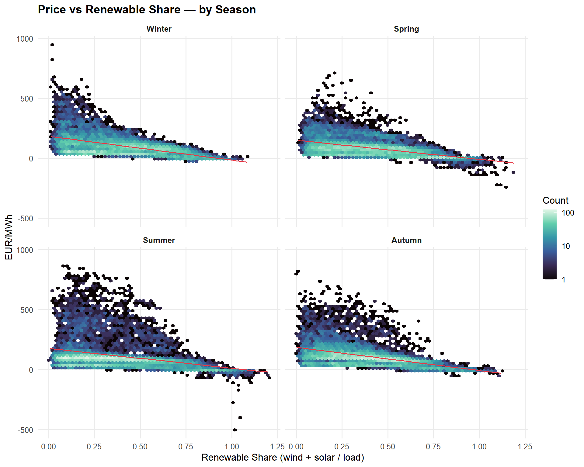 - Renewable ramp rates contribute to intra-day price volatility, particularly during evening ramp-down of solar in summer and rapid wind changes in autumn. The hour-over-hour change in renewable share explains a small but distinct fraction of variance that the level of renewable share misses.
