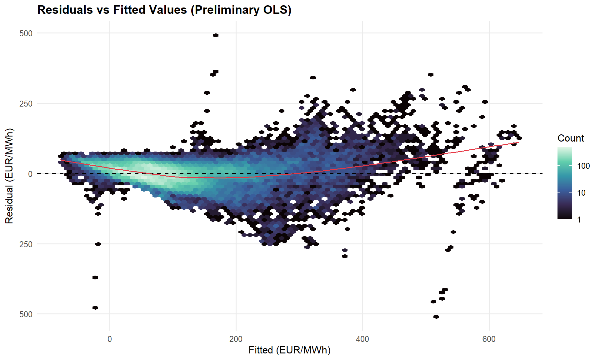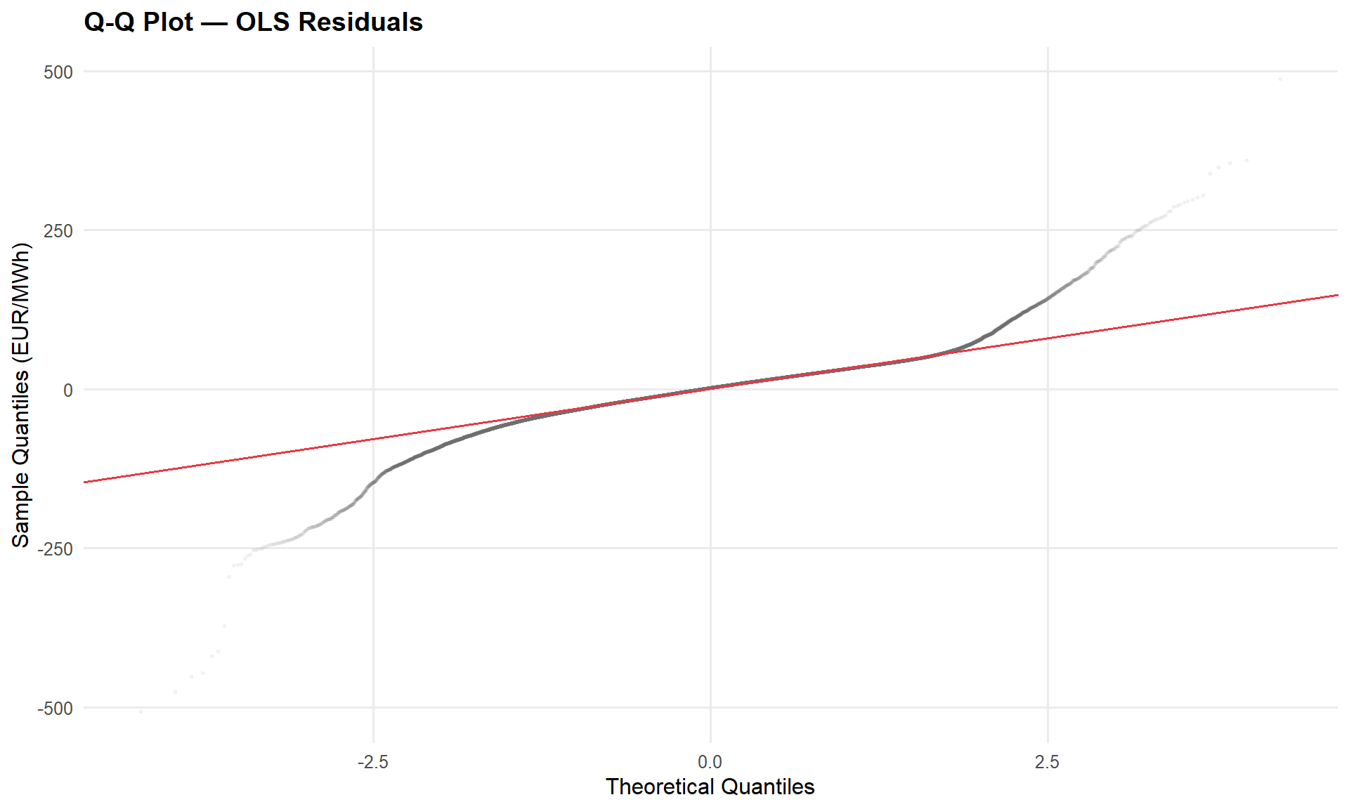 - Heteroskedasticity is a structural feature of electricity markets, not a model failure. All results are reported in raw EUR/MWh with HC-robust standard errors for valid inference. The ADF test confirms the price series is stationary, validating regression on levels.