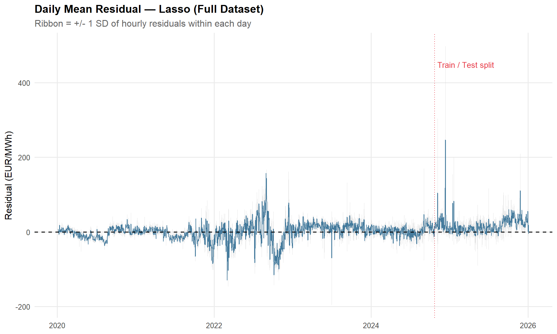 - The post-crisis lasso (2023-2025) provides a regime-specific benchmark for the current market. Comparing its test-set performance against the full-sample model reveals whether the 2022 crisis period introduces coefficient bias that hurts forecasting under stable gas prices.