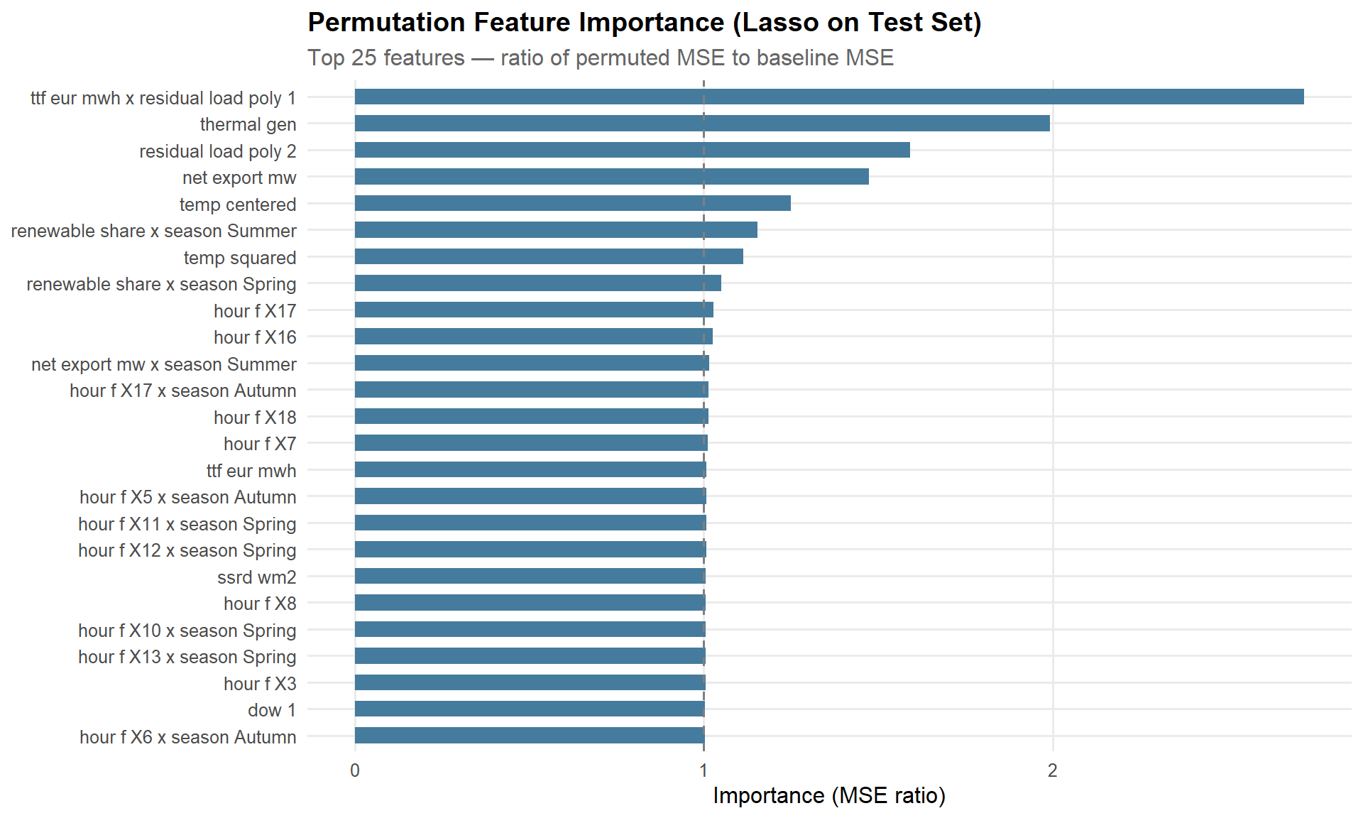 subtitle = "Top 25 features — ratio of permuted MSE to baseline MSE",